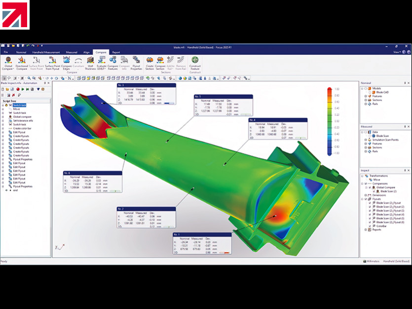 Further enhancing the software’s capabilities are the ability to analyse virtually unlimited point clouds, even those with over 100 million points, together with comprehensive point cloud tools including the proprietary FUSE algorithm, which can generate extremely high-quality polygon meshes automatically by intelligently leveraging scanner metadata. Advanced feature detection routines automatically identify and analyse geometric elements, ranging from simple holes and slots to complex fir-tree and T-stud features. The software also supports tactile probing and a leapfrog function to inspect very large parts by moving the measuring device. Virtual assembly functionality allows digital copies of reference parts to be used to build an assembly with a CAD model or point cloud data, saving material and time by avoiding expensive templates, fixtures and lengthy physical assembly builds.