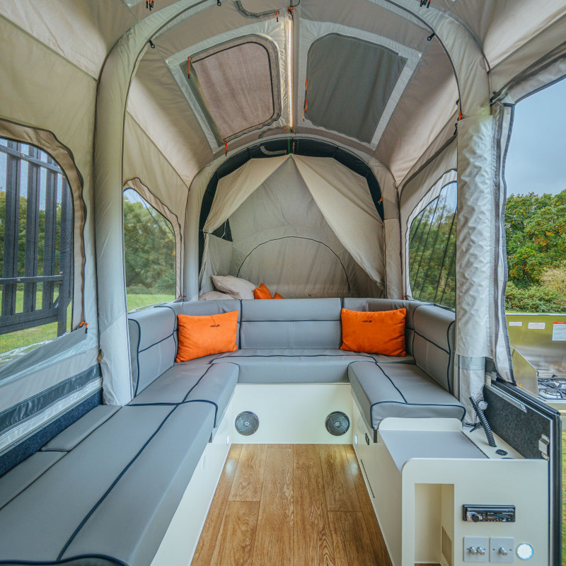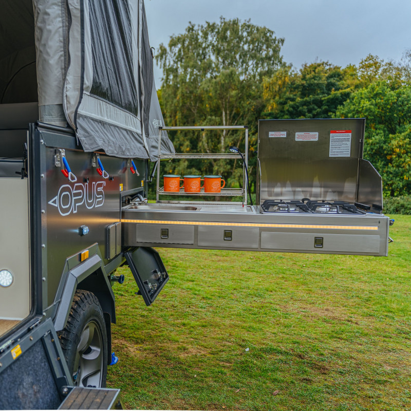 Enhanced overlanding capabilities, a dynamic outside kitchen with a stainless steel 4 burner hob and sink, 80 litres of on-board water storage, built in entertainment system and much more, all included in our most equipped self-inflating camper ever.