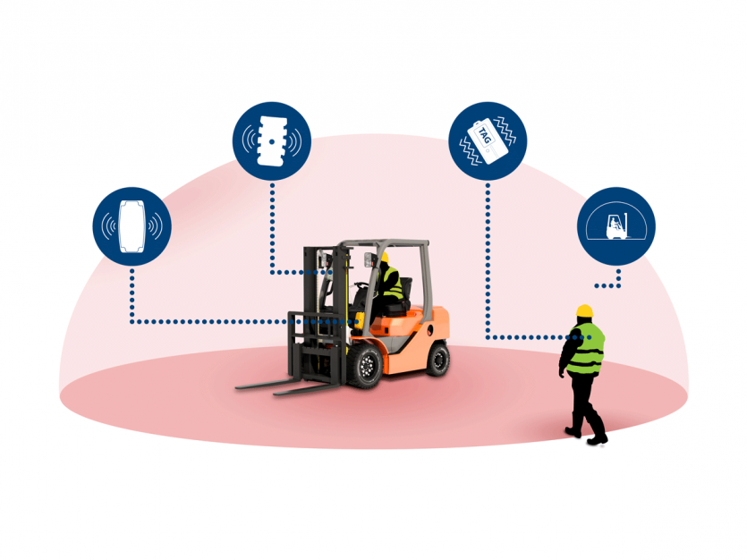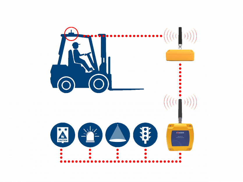 ZoneSafe uses RFID technology to create an adjustable detection zone around vehicles. The system instantly alerts the operator when an RFID transponder enters this zone.