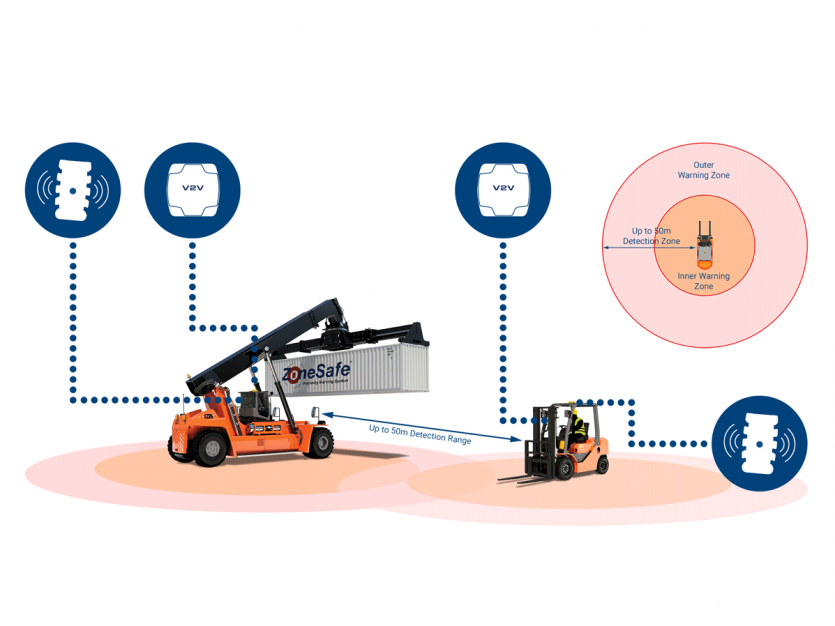 Vehicle-to-Vehicle (V2V): Reduces collisions between vehicles by instantly warning operators when it detects the transponder on another ZoneSafe-equipped vehicle.