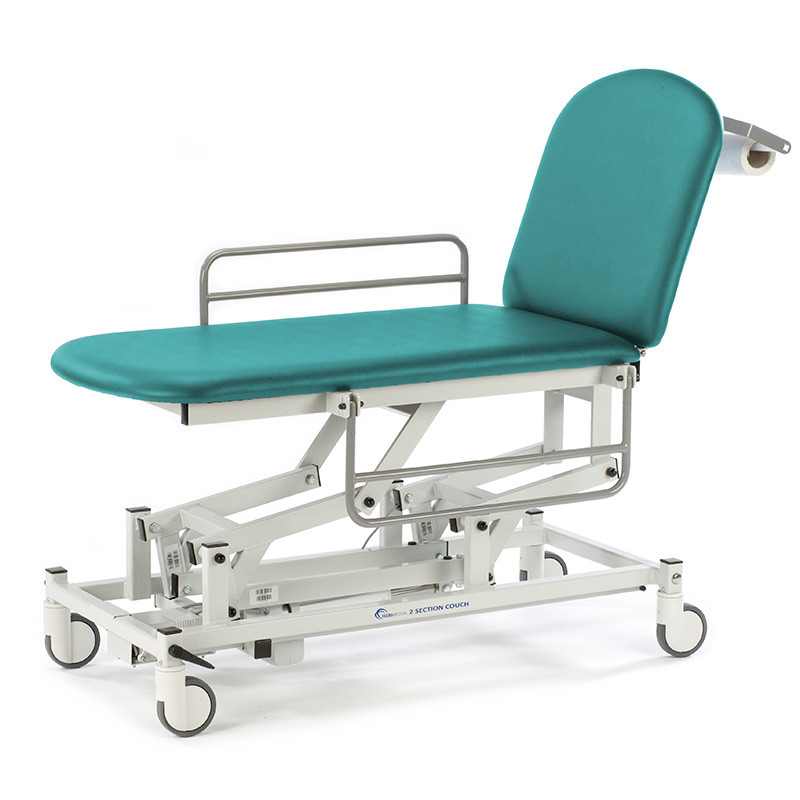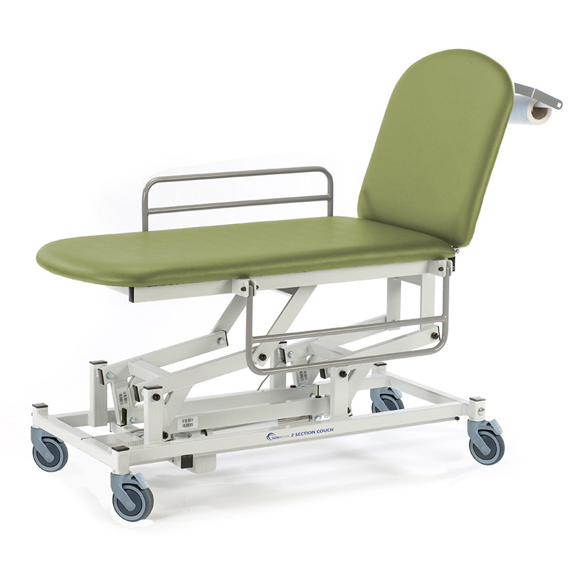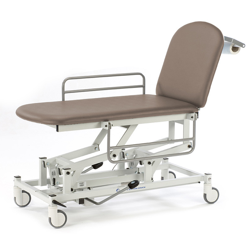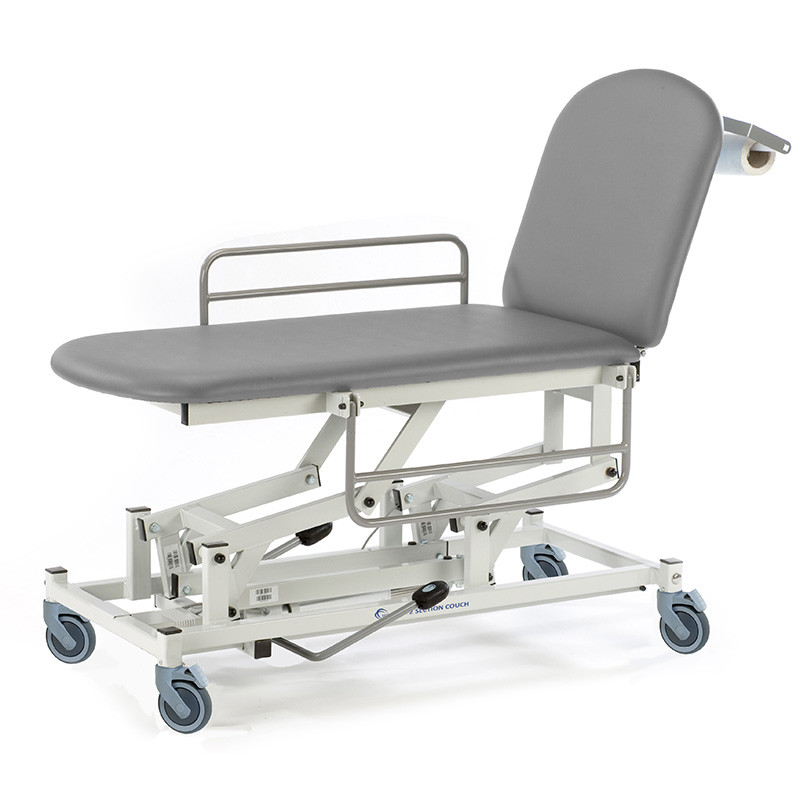 A very strong and rigid hydraulic mobile treatment couch with side support rails and a paper roll holder. The large wheel system incorporates a steering facility and the couch has an excellent height range.