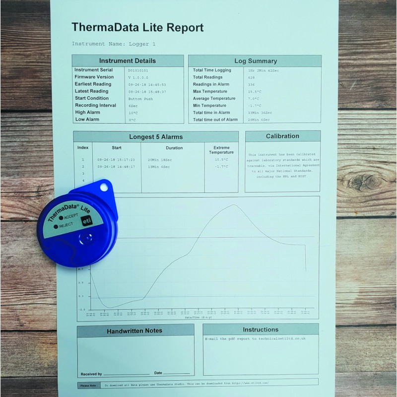 The new ThermaData Lite produces a report automatically on computer plug-in, this report will detail high and low alarms and also give you various key information for acceptance for deliveries or processes. No software required to download PDF report. The automatic report generated shows key information such as instrument details, log summary and longest alarms. The PDF also displays an intuitive graph for easy visual indication.